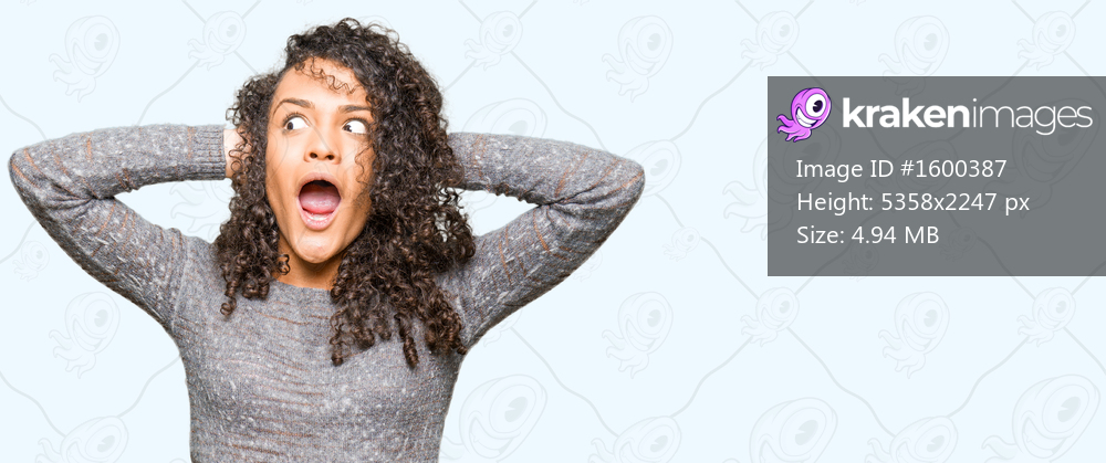 Young beautiful woman with curly hair wearing grey sweater Crazy and scared with hands on head, afraid and surprised of shock with open mouth