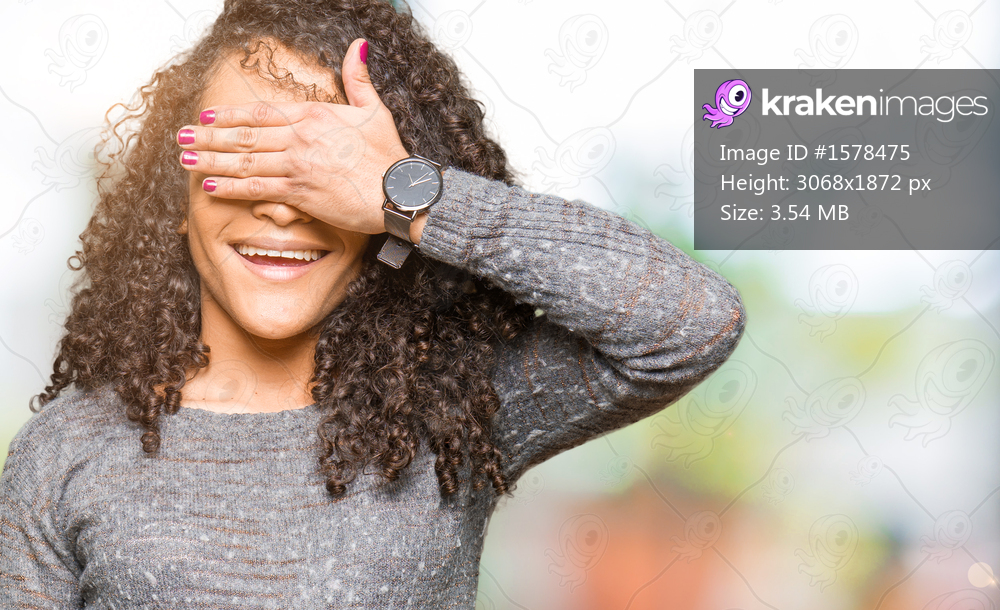Young beautiful woman with curly hair wearing grey sweater smiling and laughing with hand on face covering eyes for surprise. Blind concept.