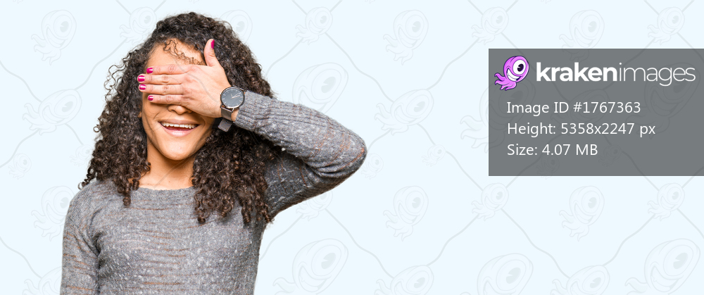 Young beautiful woman with curly hair wearing grey sweater smiling and laughing with hand on face covering eyes for surprise. Blind concept.