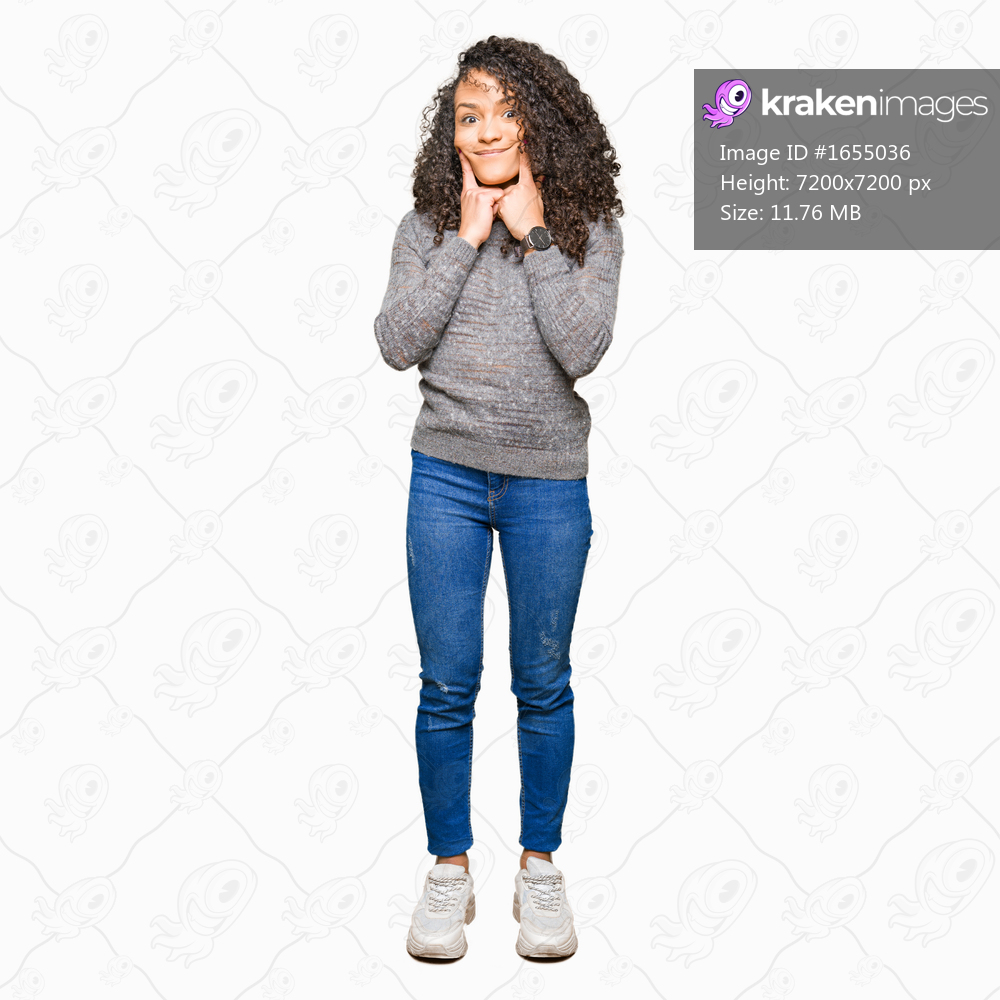Young beautiful woman with curly hair wearing grey sweater Smiling with open mouth, fingers pointing and forcing cheerful smile