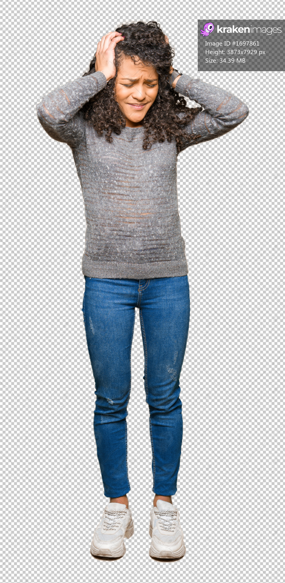 Young beautiful woman with curly hair wearing grey sweater suffering from headache desperate and stressed because pain and migraine. Hands on head.