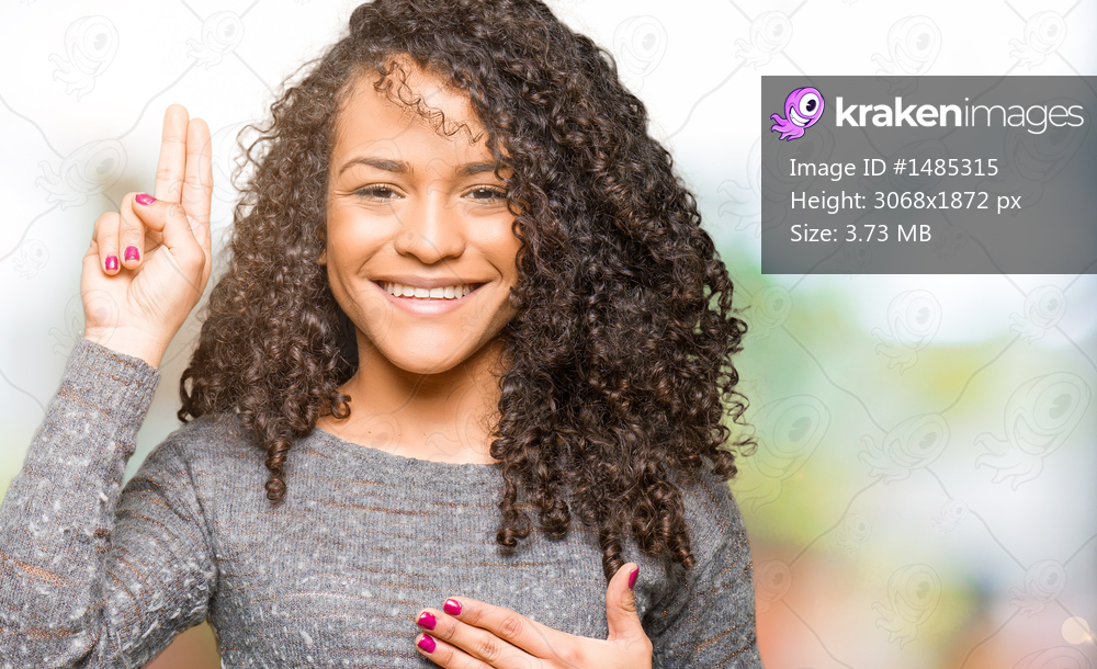 Young beautiful woman with curly hair wearing grey sweater Swearing with hand on chest and fingers, making a loyalty promise oath