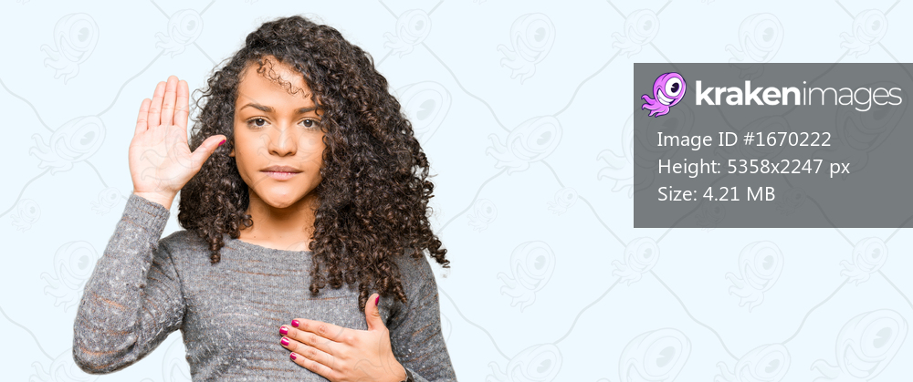 Young beautiful woman with curly hair wearing grey sweater Swearing with hand on chest and open palm, making a loyalty promise oath