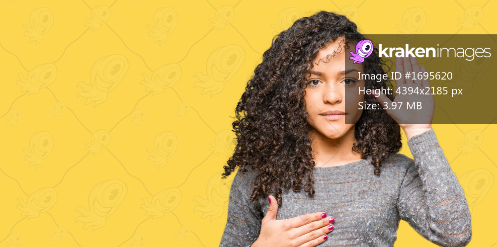 Young beautiful woman with curly hair wearing grey sweater Swearing with hand on chest and open palm, making a loyalty promise oath