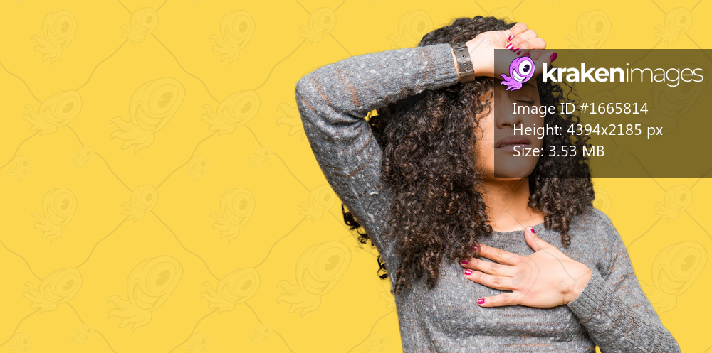 Young beautiful woman with curly hair wearing grey sweater Touching forehead for illness and fever, flu and cold, virus sick