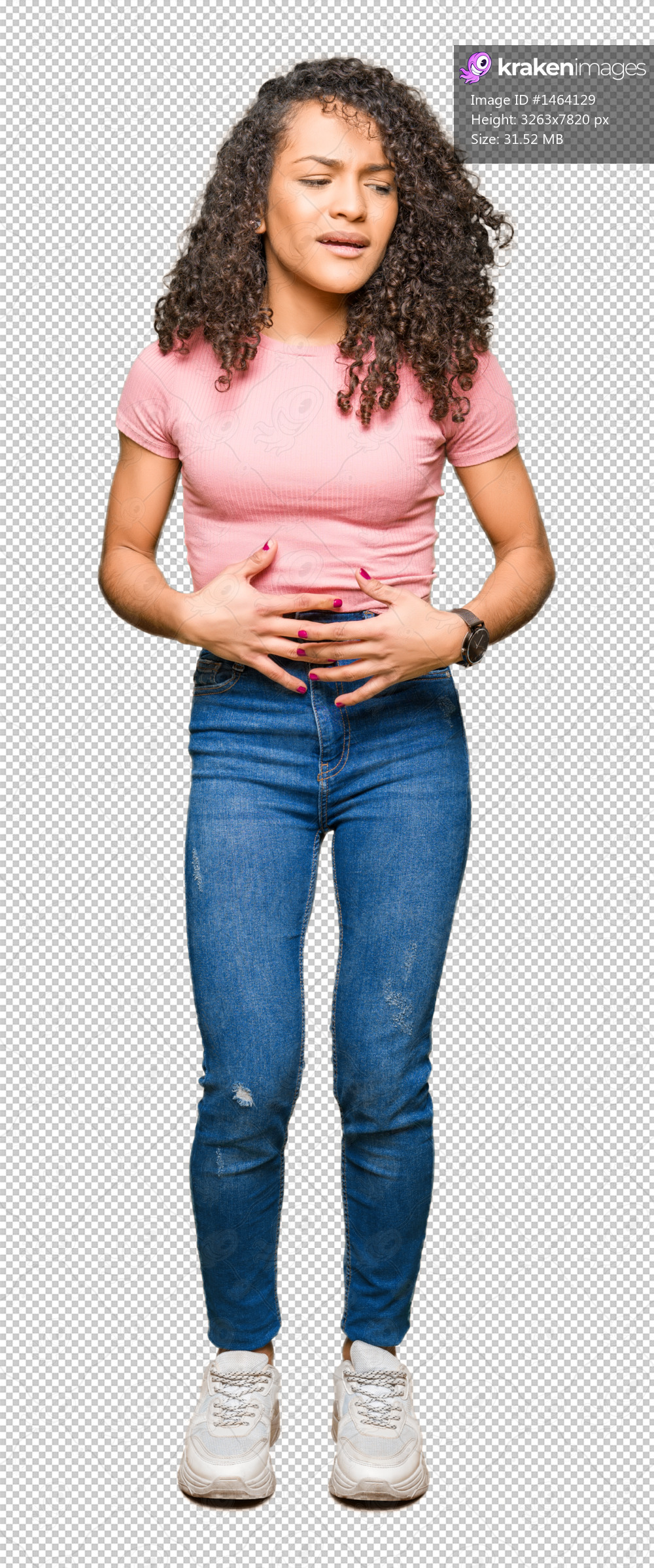 Young beautiful woman with curly hair wearing pink t-shirt with hand on stomach because nausea, painful disease feeling unwell. Ache concept.
