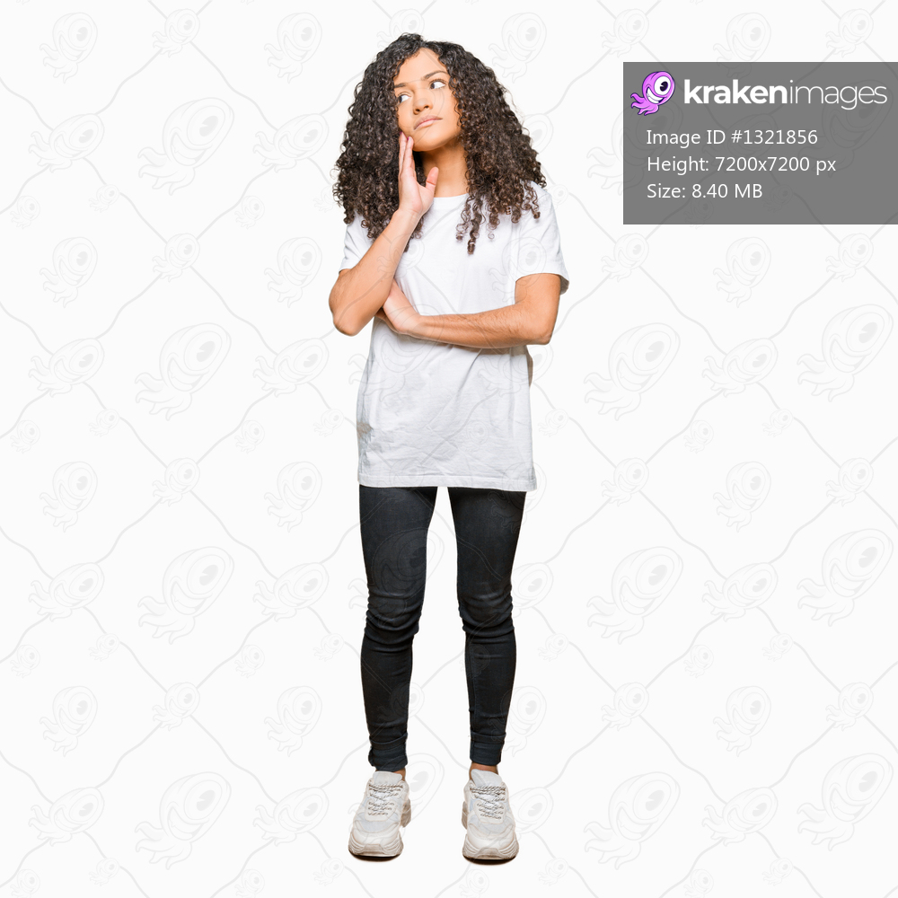 Young beautiful woman with curly hair wearing white t-shirt with hand on chin thinking about question, pensive expression. Smiling with thoughtful face. Doubt concept. - Kraken Images