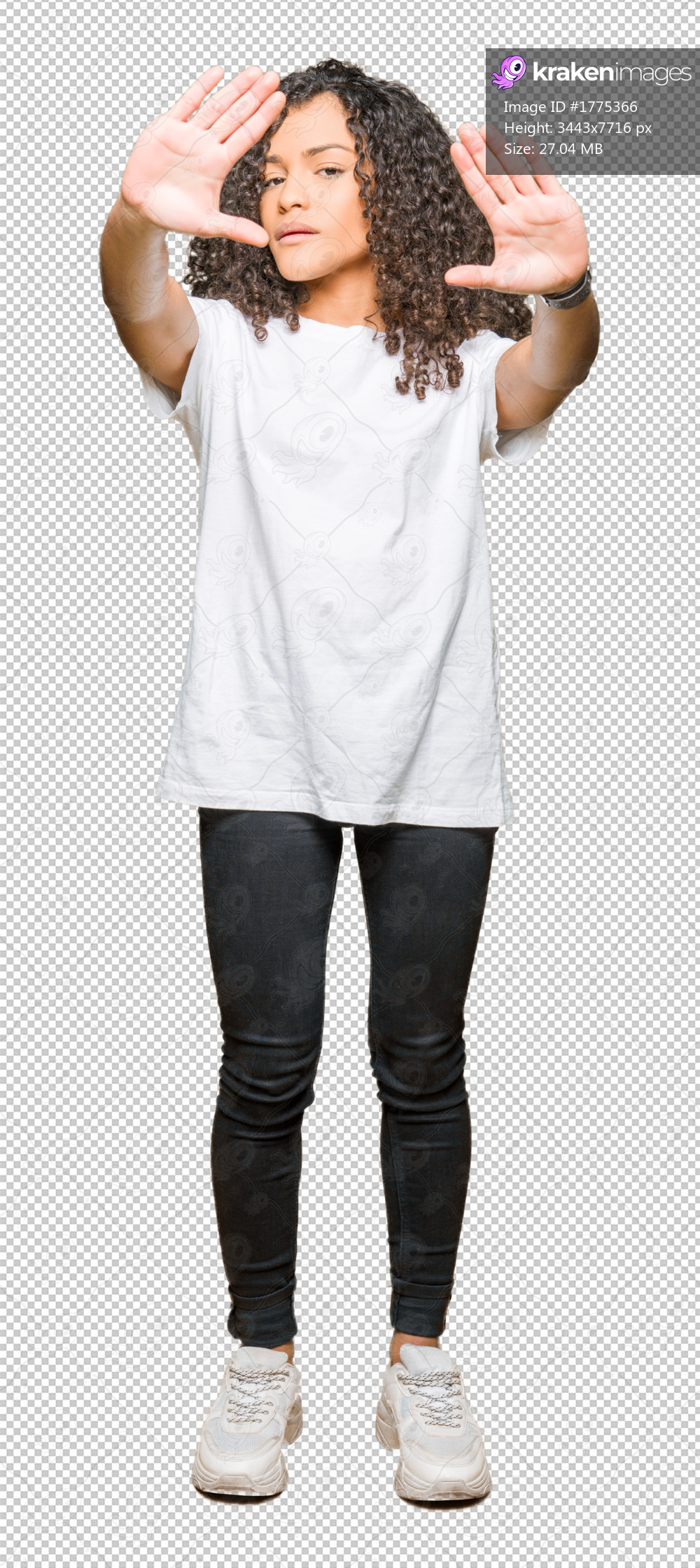 Young beautiful woman with curly hair wearing white t-shirt Smiling doing frame using hands palms and fingers, camera perspective