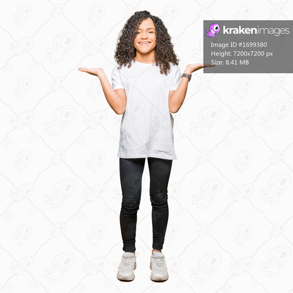 Young beautiful woman with curly hair wearing white t-shirt Smiling showing both hands open palms, presenting and advertising comparison and balance