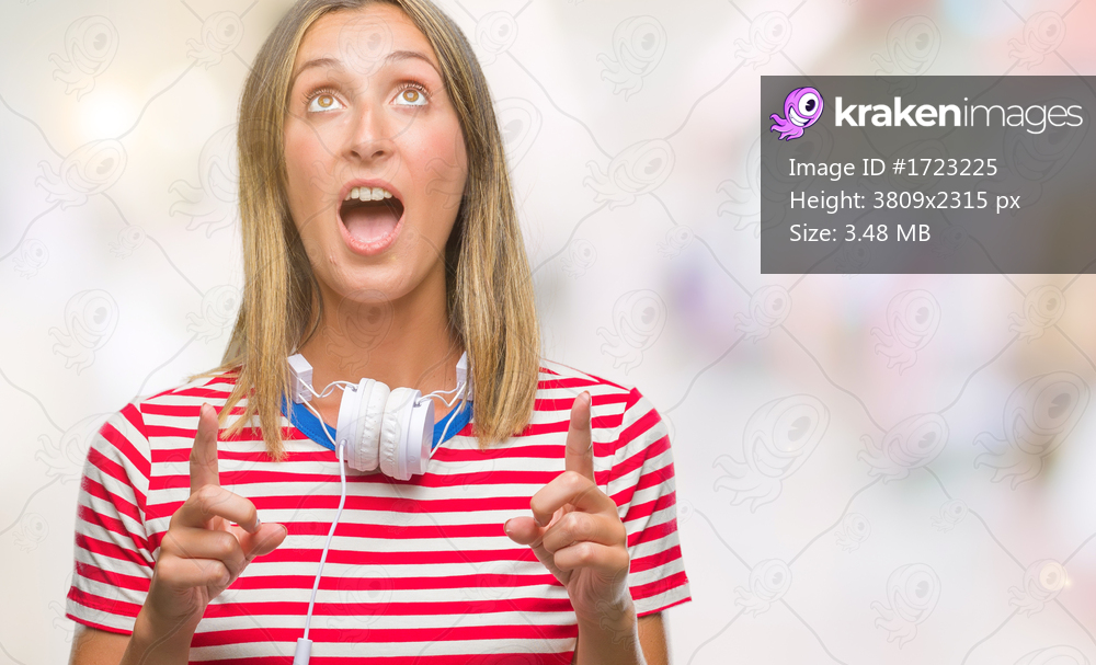 Young beautiful woman listening music wearing headphones over isolated background amazed and surprised looking up and pointing with fingers and raised arms. - Kraken Images