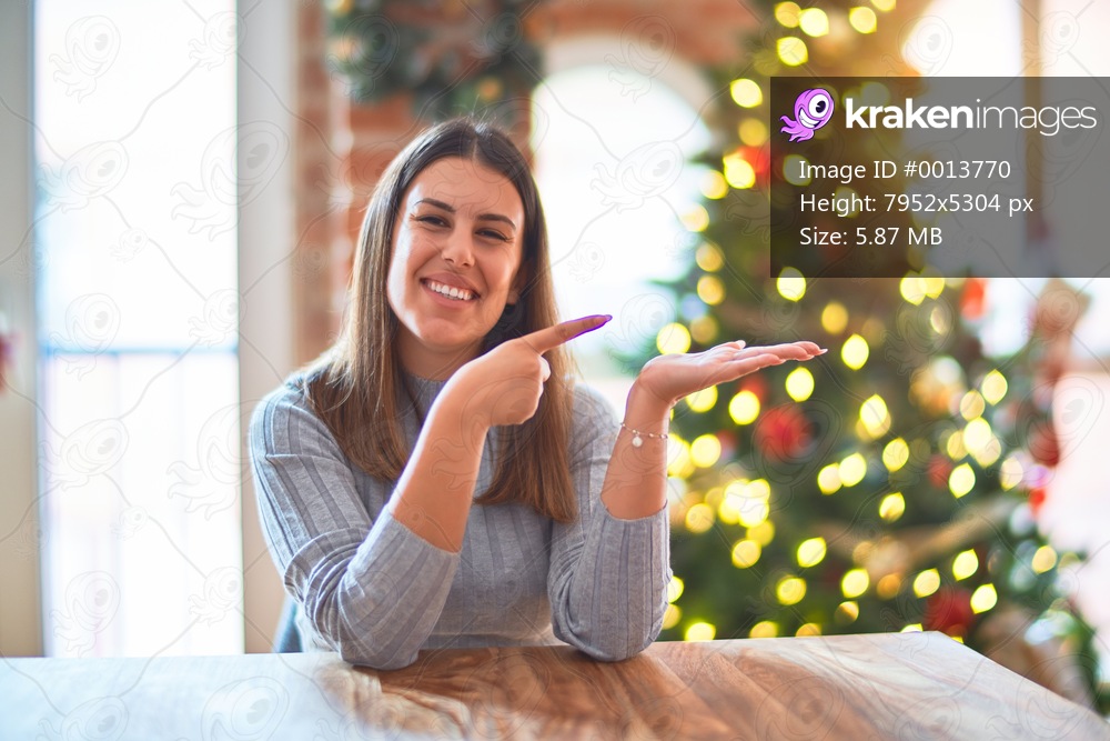 Young beautiful woman sitting at the table at home around christmas tree and decoration amazed and smiling to the camera while presenting with hand and pointing with finger. - Kraken Images