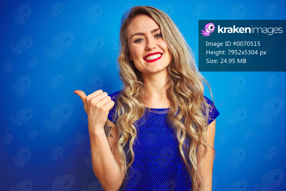 Young beautiful woman standing over blue isolated background smiling with happy face looking and pointing to the side with thumb up.