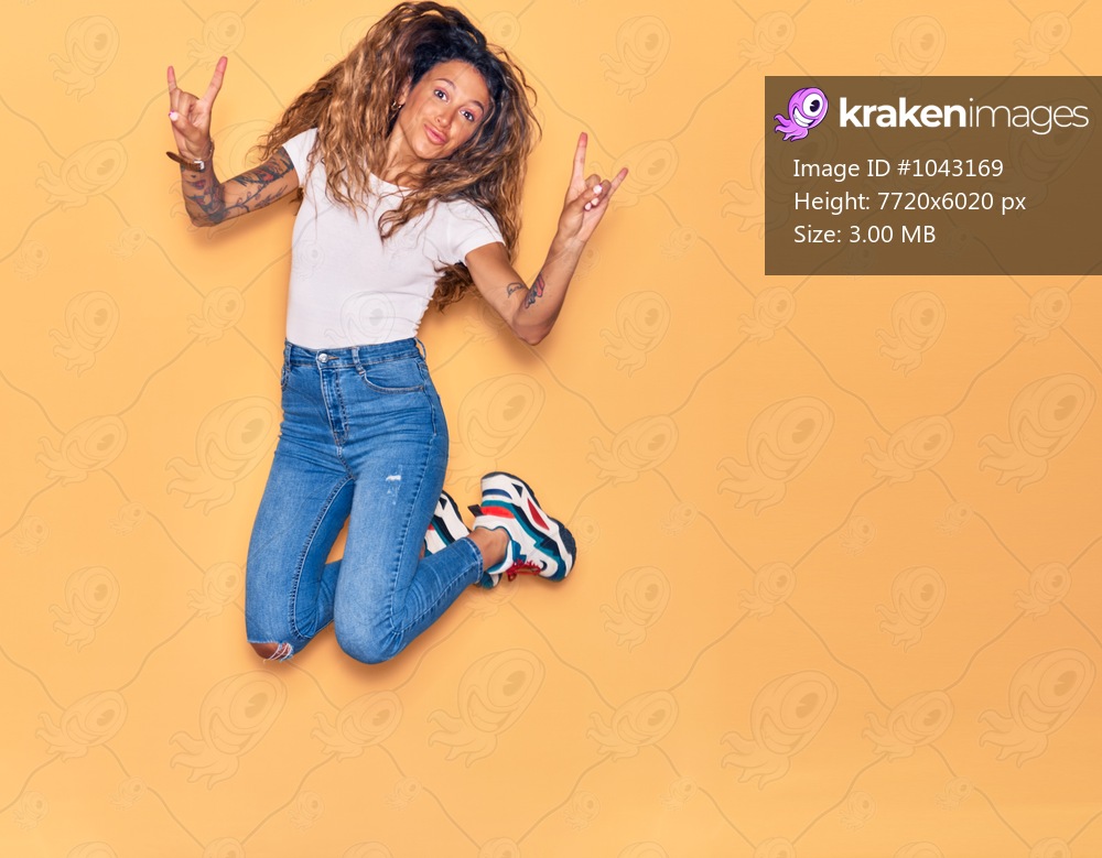 Young beautiful woman with tattoo wearing casual clothes smiling happy. Jumping with smile on face doing rocker sign over isolated yellow background