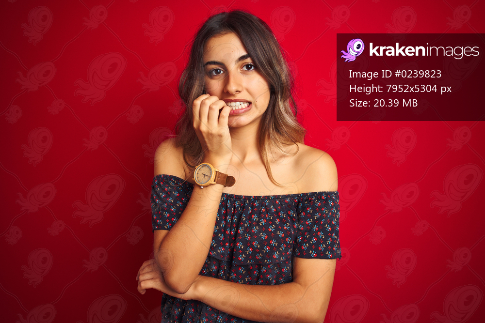 Young beautiful woman wearing a floral t-shirt over red isolated background looking stressed and nervous with hands on mouth biting nails. Anxiety problem. - Kraken Images