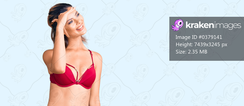 Young beautiful woman wearing bikini very happy and smiling looking far away with hand over head. searching concept.