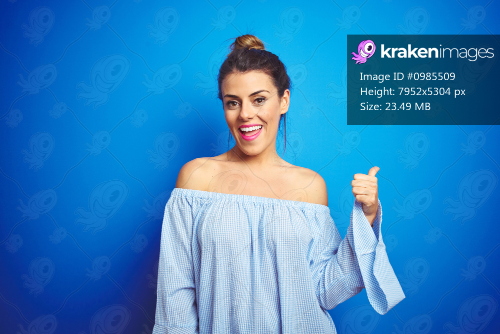 Young beautiful woman wearing bun hairstyle over blue isolated background smiling with happy face looking and pointing to the side with thumb up.