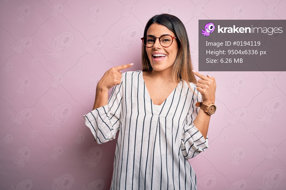 Young beautiful woman wearing casual striped t-shirt and glasses over pink background smiling cheerful showing and pointing with fingers teeth and mouth. Dental health concept. - Kraken Images
