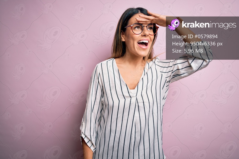 Young beautiful woman wearing casual striped t-shirt and glasses over pink background very happy and smiling looking far away with hand over head. Searching concept. - Kraken Images