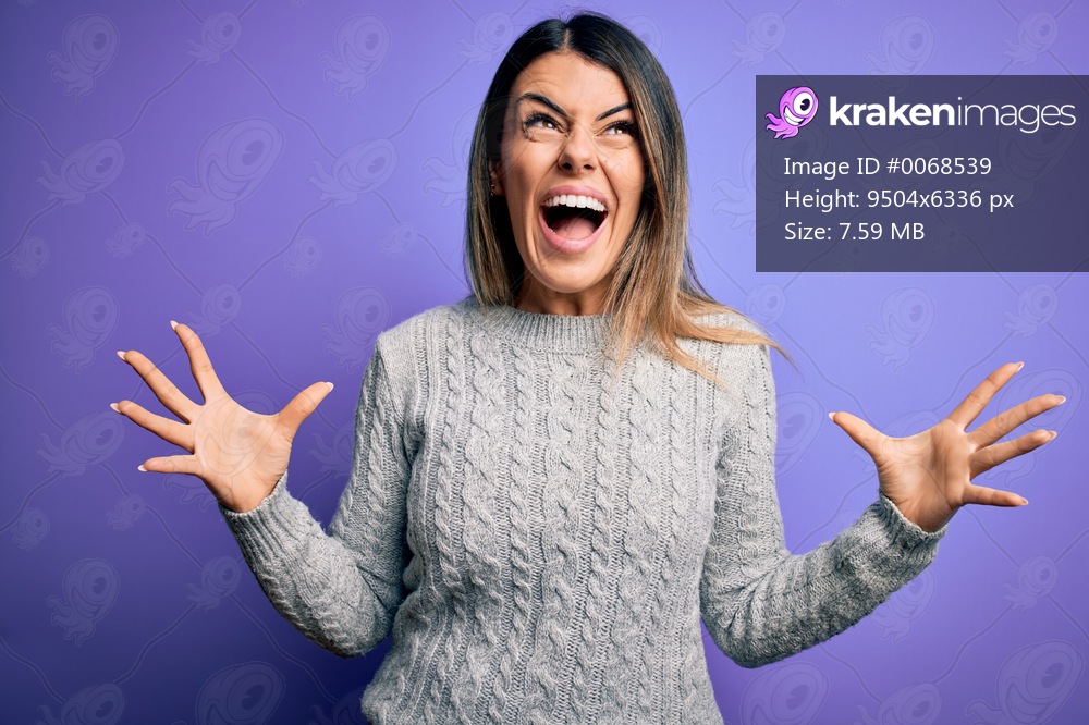 Young beautiful woman wearing casual sweater standing over isolated purple background crazy and mad shouting and yelling with aggressive expression and arms raised. Frustration concept. - Kraken Images