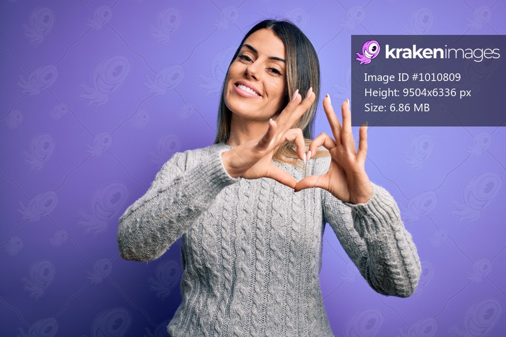 Young beautiful woman wearing casual sweater standing over isolated purple background smiling in love doing heart symbol shape with hands. Romantic concept. - Kraken Images