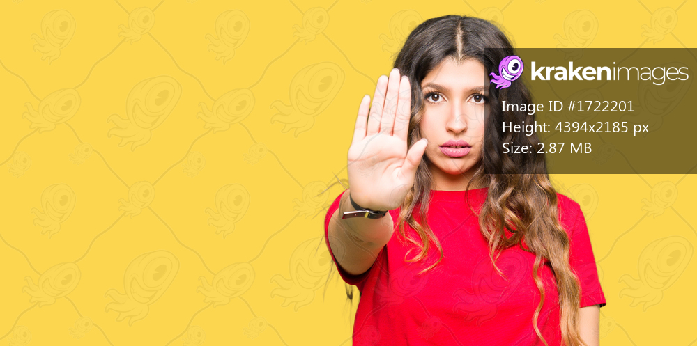 Young beautiful woman wearing casual t-shirt doing stop sing with palm of the hand. Warning expression with negative and serious gesture on the face.