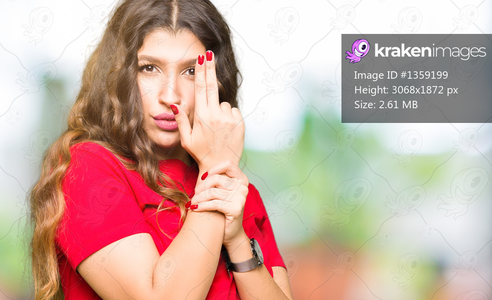 Young beautiful woman wearing casual t-shirt Holding symbolic gun with hand gesture, playing killing shooting weapons, angry face