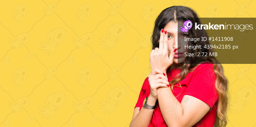 Young beautiful woman wearing casual t-shirt Holding symbolic gun with hand gesture, playing killing shooting weapons, angry face
