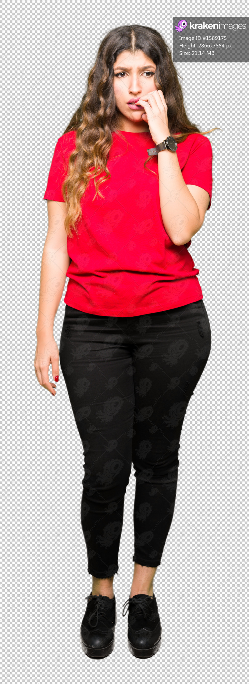 Young beautiful woman wearing casual t-shirt looking stressed and nervous with hands on mouth biting nails. Anxiety problem.