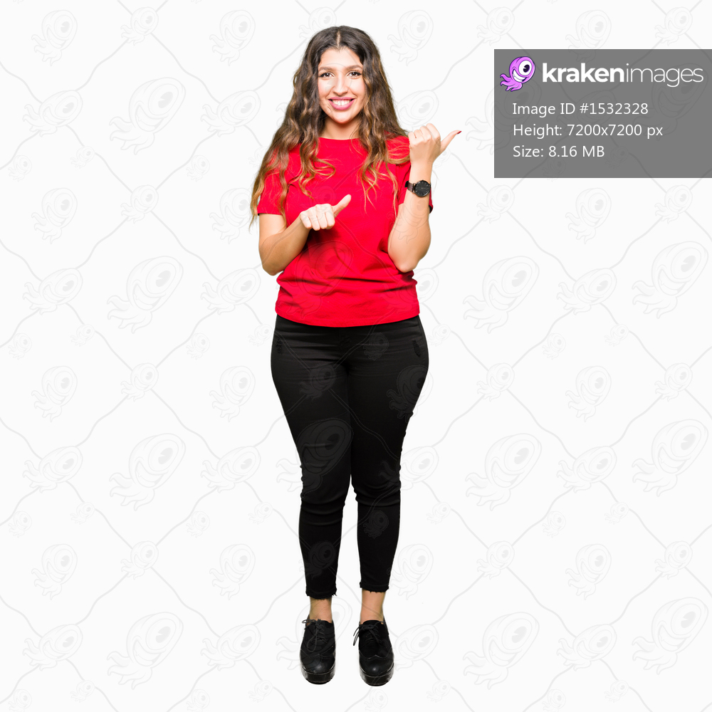 Young beautiful woman wearing casual t-shirt Pointing to the back behind with hand and thumbs up, smiling confident