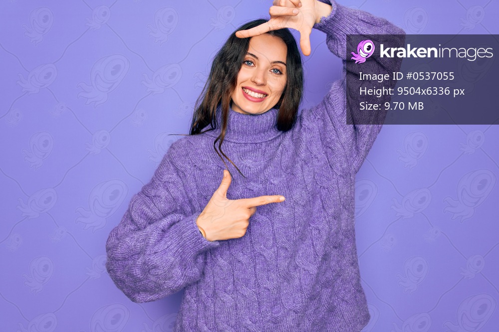 Young beautiful woman wearing casual turtleneck sweater standing over purple background smiling making frame with hands and fingers with happy face. Creativity and photography concept. - Kraken Images