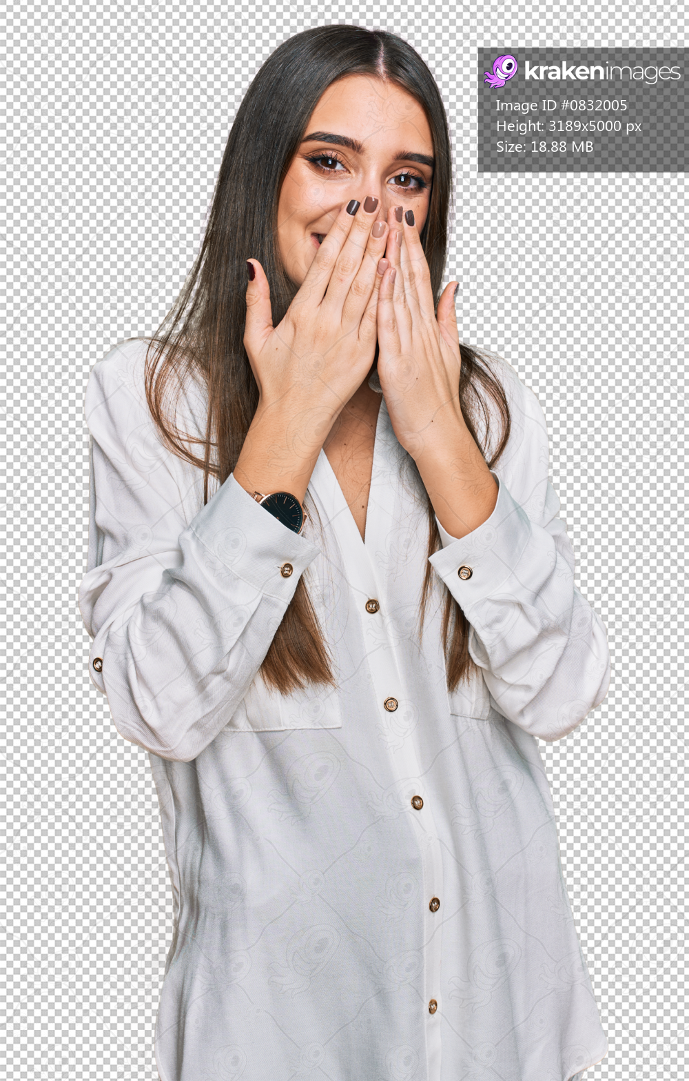 Young beautiful woman wearing casual white shirt laughing and embarrassed giggle covering mouth with hands, gossip and scandal concept