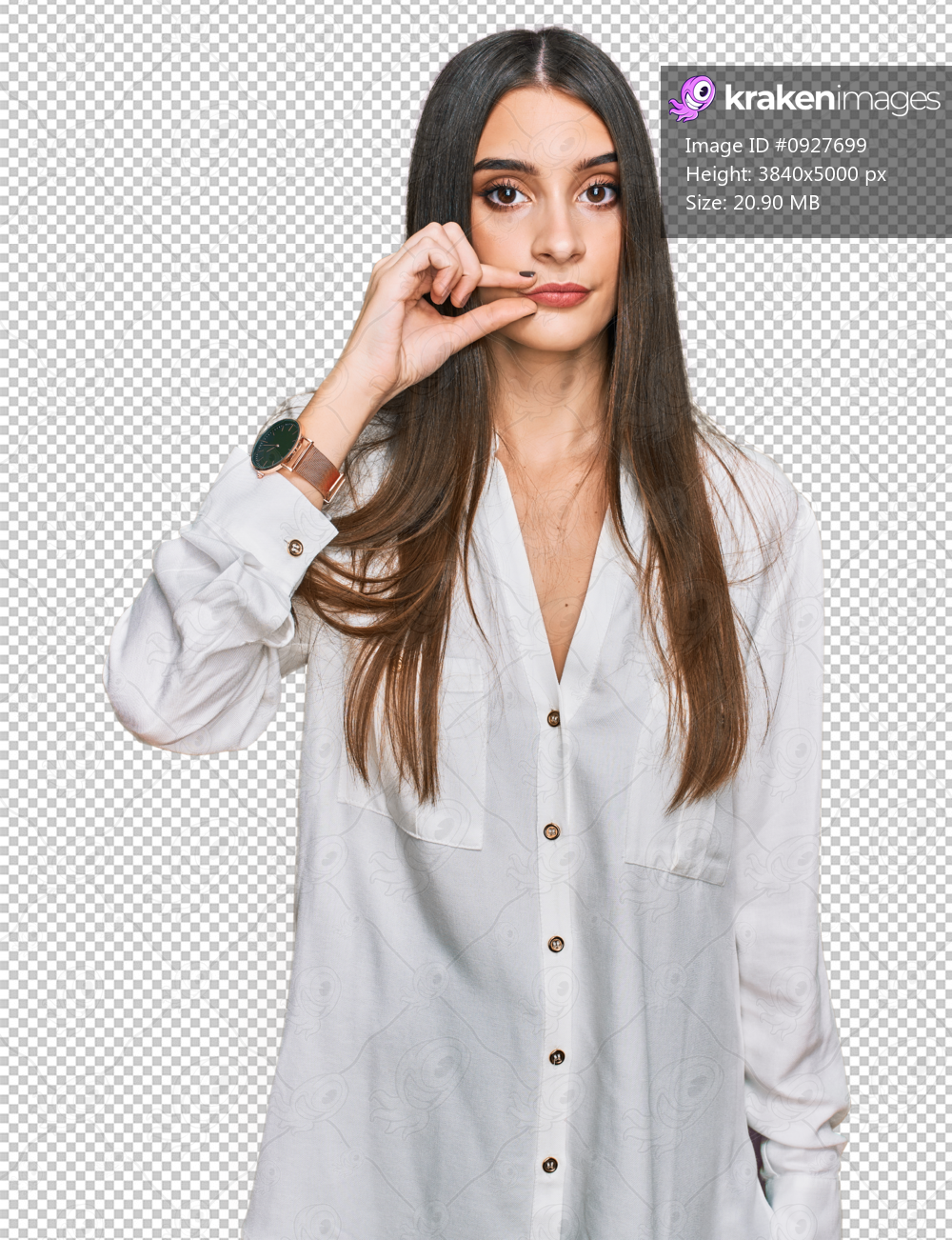 Young beautiful woman wearing casual white shirt mouth and lips shut as zip with fingers. secret and silent, taboo talking