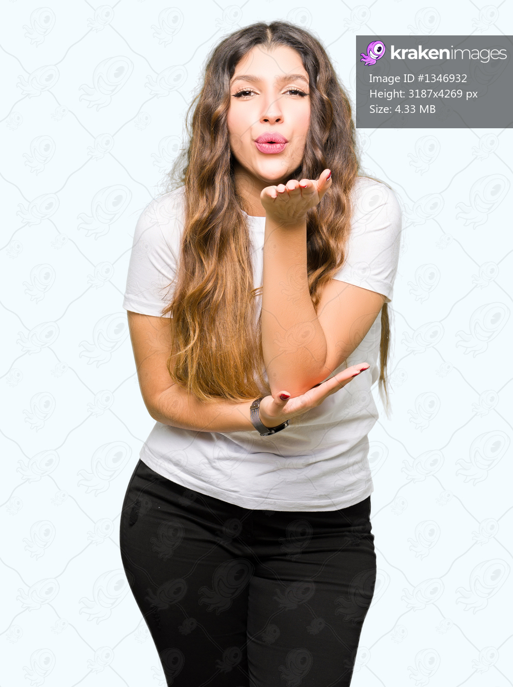 Young beautiful woman wearing casual white t-shirt looking at the camera blowing a kiss with hand on air being lovely and sexy. Love expression.