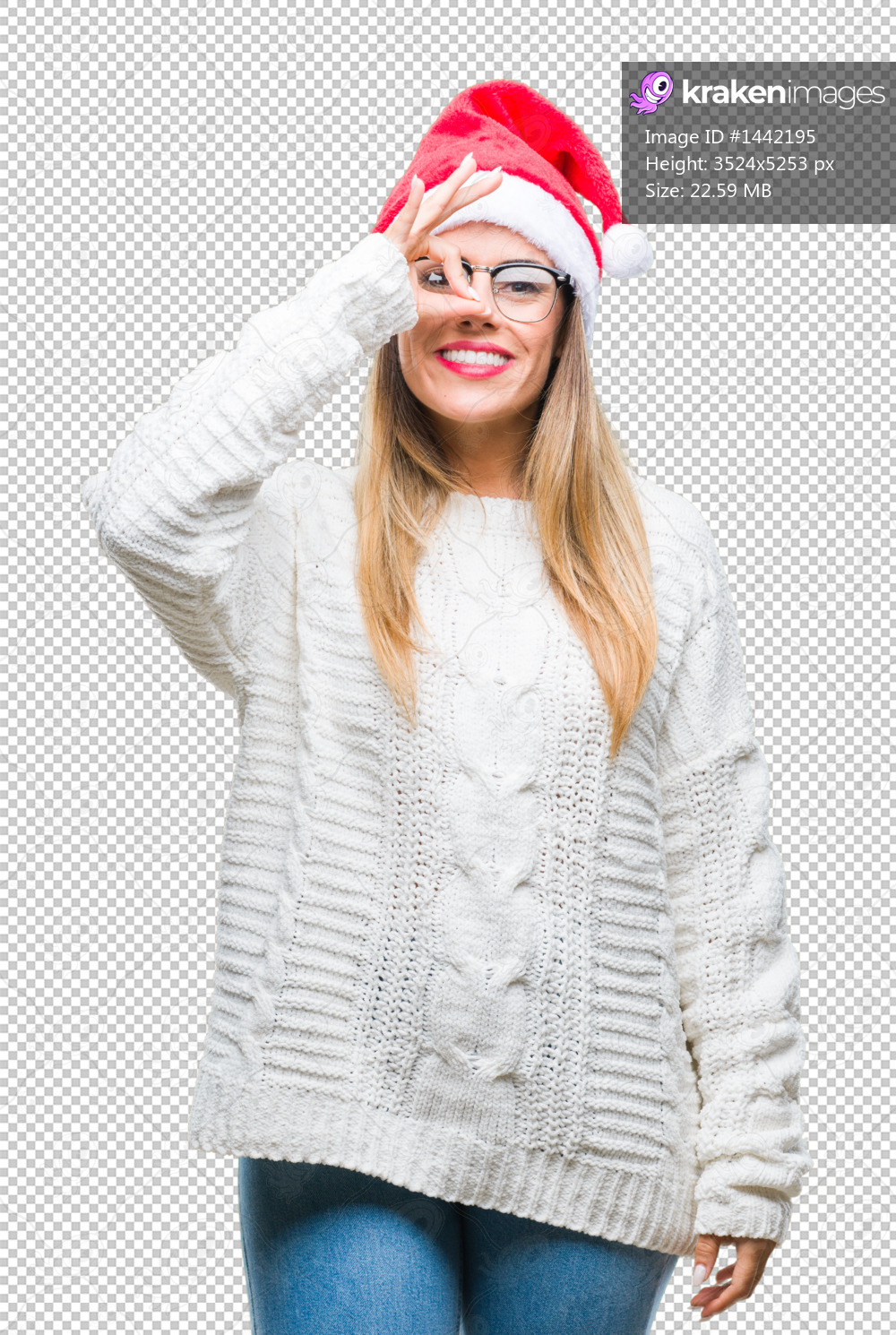 Young beautiful woman wearing christmas hat over isolated background doing ok gesture with hand smiling, eye looking through fingers with happy face.