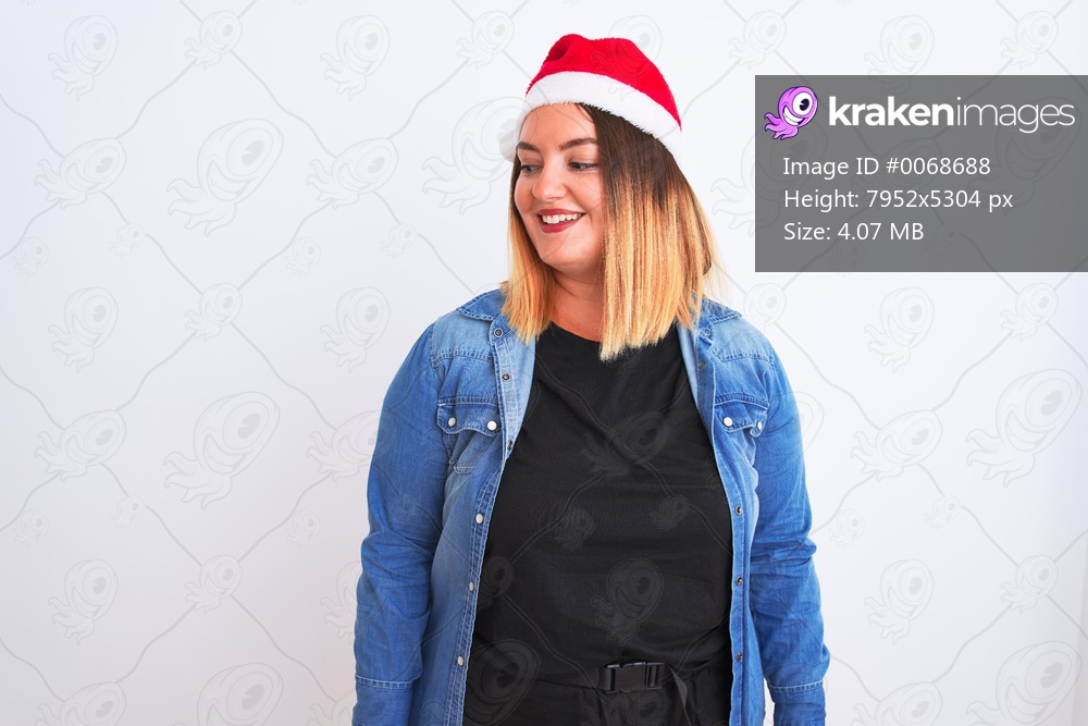 Young beautiful woman wearing Christmas Santa hat standing over isolated white background looking away to side with smile on face, natural expression. Laughing confident. - Kraken Images