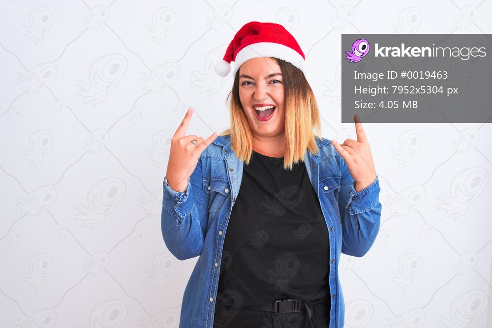 Young beautiful woman wearing Christmas Santa hat standing over isolated white background shouting with crazy expression doing rock symbol with hands up. Music star. Heavy concept. - Kraken Images