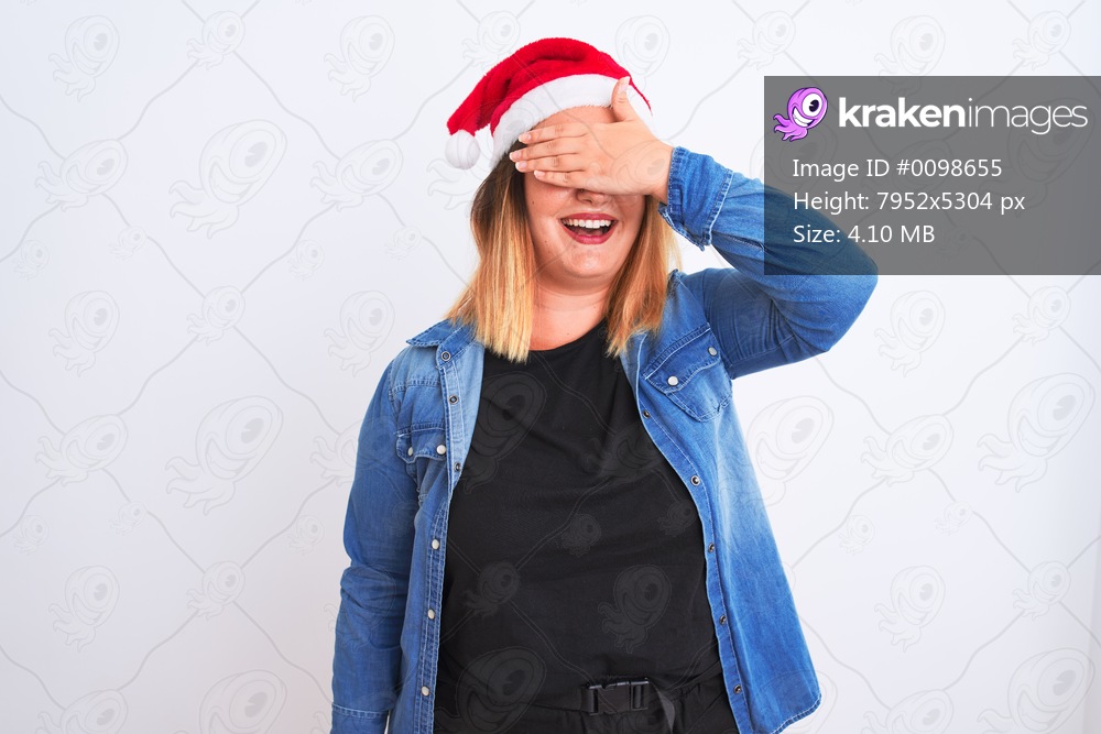 Young beautiful woman wearing Christmas Santa hat standing over isolated white background smiling and laughing with hand on face covering eyes for surprise. Blind concept. - Kraken Images