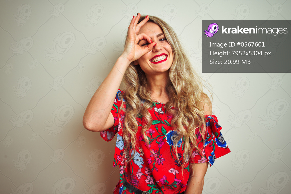 Young beautiful woman wearing floral t-shirt over white isolated background doing ok gesture with hand smiling, eye looking through fingers with happy face. - Kraken Images