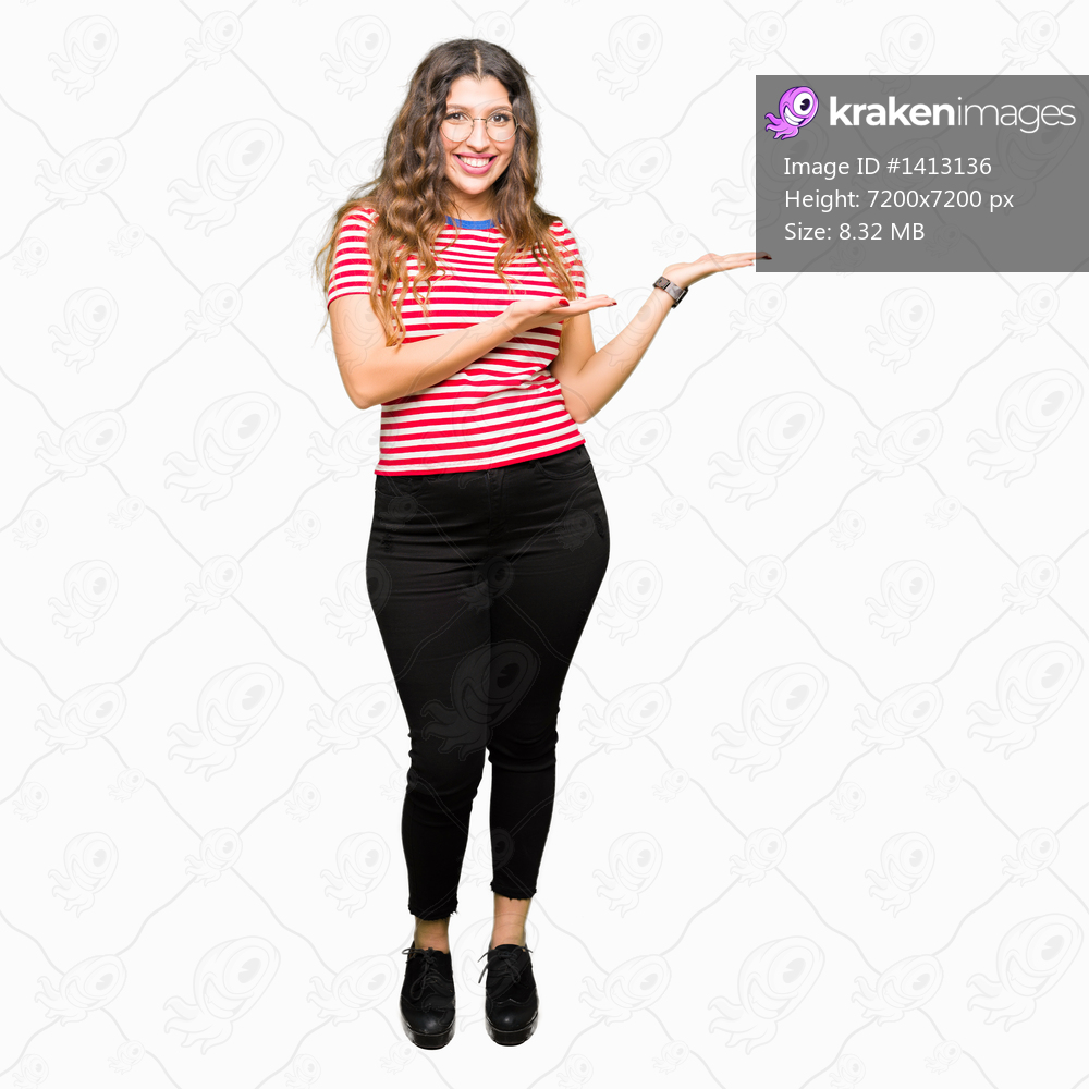 Young beautiful woman wearing glasses Pointing to the side with hand and open palm, presenting ad smiling happy and confident