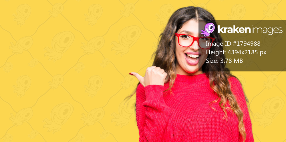 Young beautiful woman wearing red glasses smiling with happy face looking and pointing to the side with thumb up.