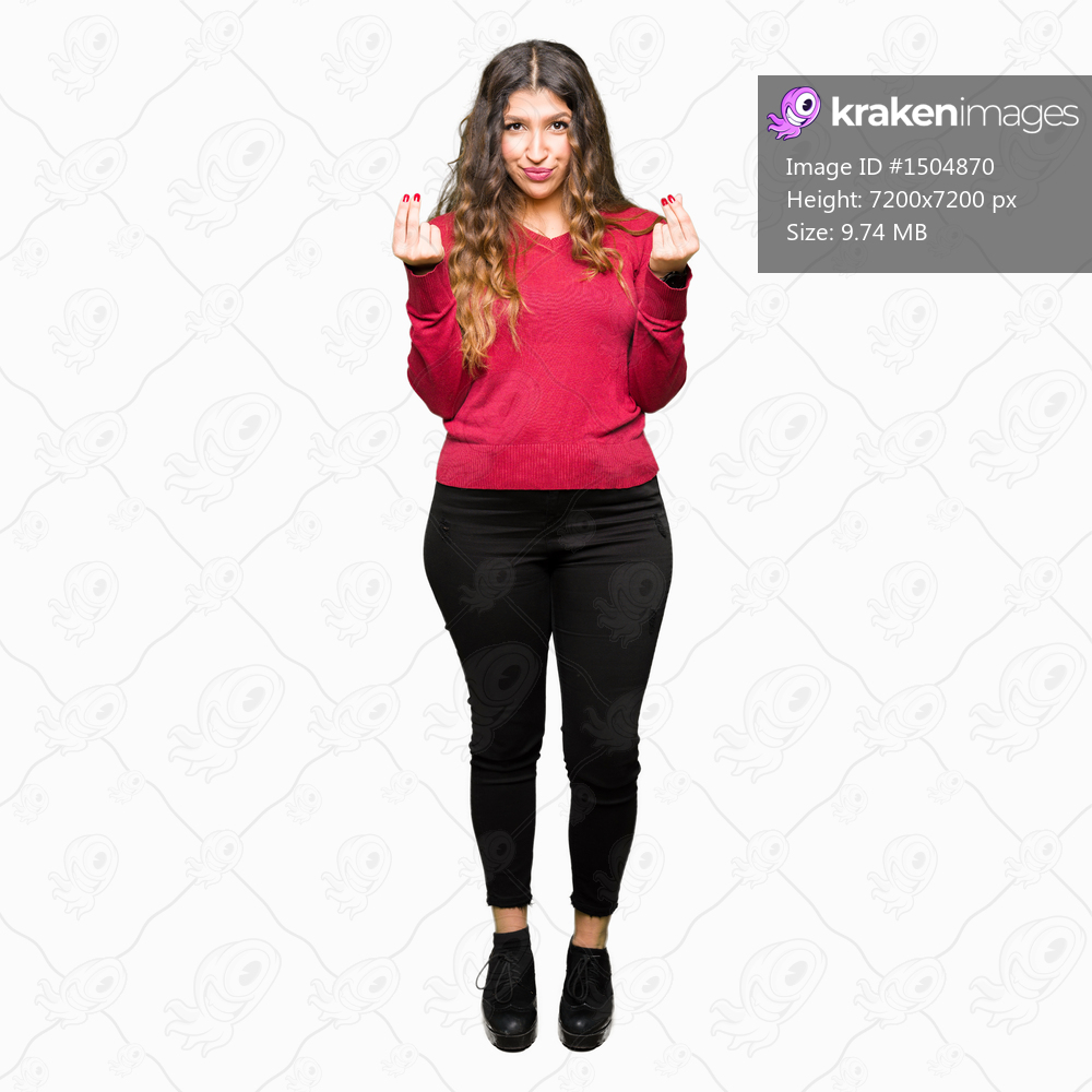 Young beautiful woman wearing red sweater Doing money gesture with hand, asking for salary payment, millionaire business