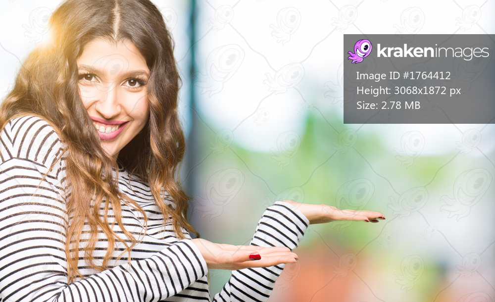 Young beautiful woman wearing stripes sweater Pointing to the side with hand and open palm, presenting ad smiling happy and confident