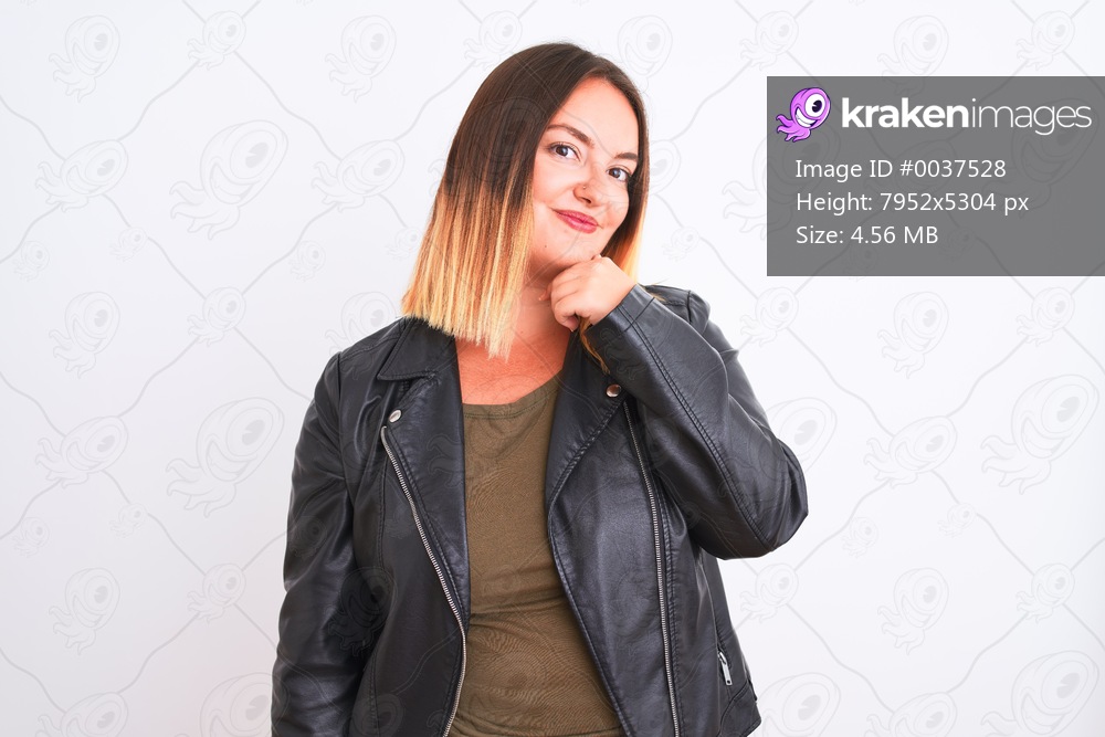 Young beautiful woman wearing t-shirt and jacket standing over isolated white background looking confident at the camera smiling with crossed arms and hand raised on chin. Thinking positive. - Kraken Images