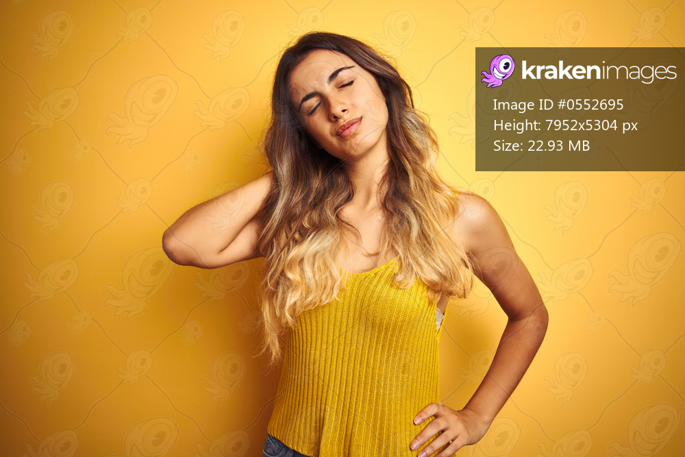 Young beautiful woman wearing t-shirt over yellow isolated background Suffering of neck ache injury, touching neck with hand, muscular pain