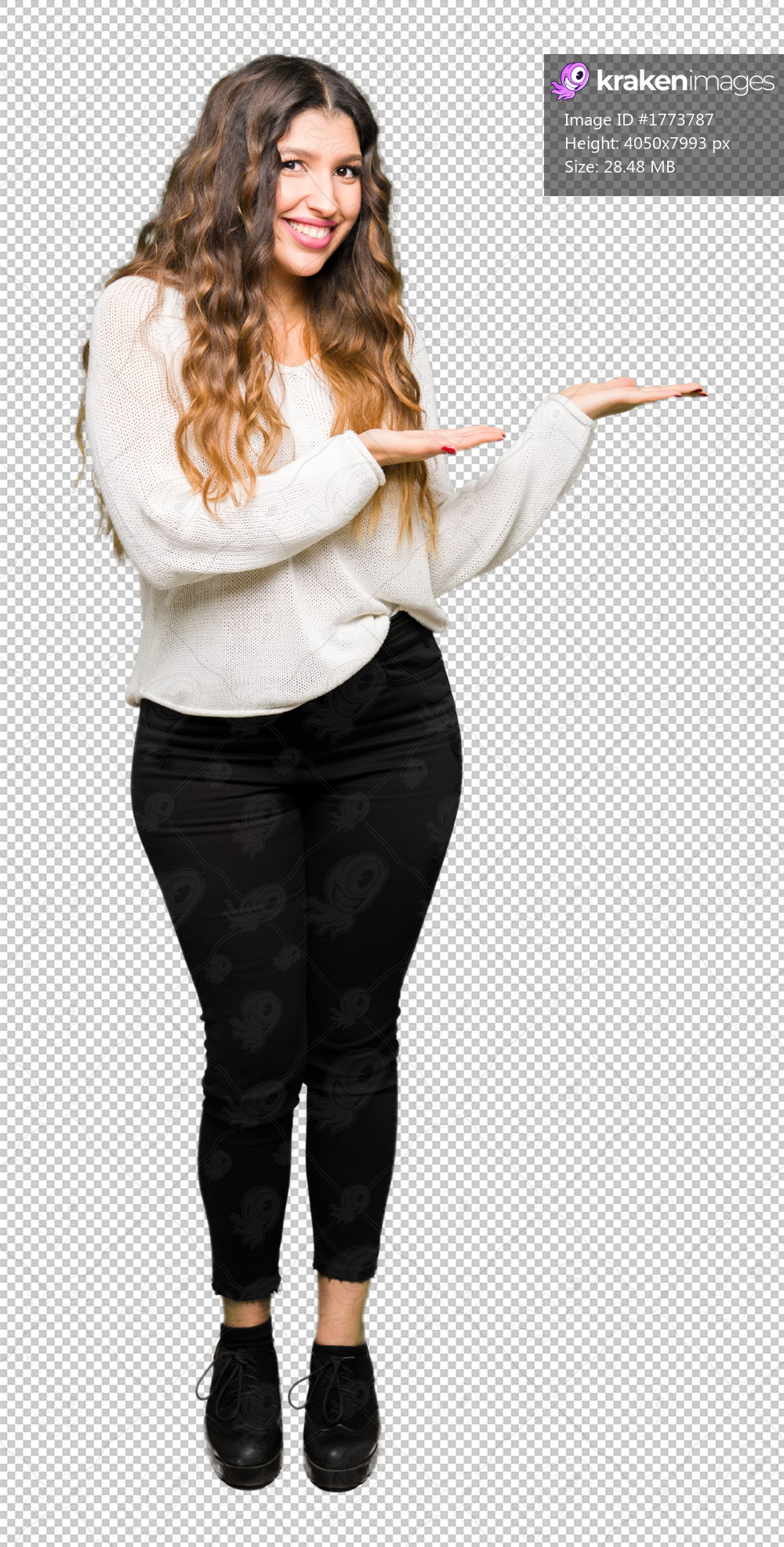 Young beautiful woman wearing white sweater Pointing to the side with hand and open palm, presenting ad smiling happy and confident
