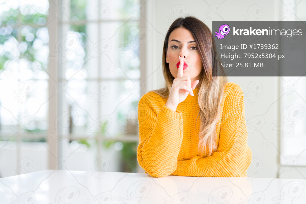 Young beautiful woman wearing winter sweater at home asking to be quiet with finger on lips. Silence and secret concept.