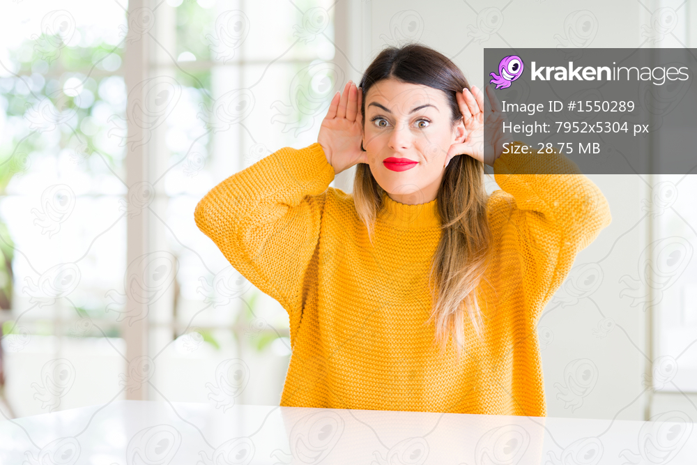 Young beautiful woman wearing winter sweater at home Trying to hear both hands on ear gesture, curious for gossip. Hearing problem, deaf