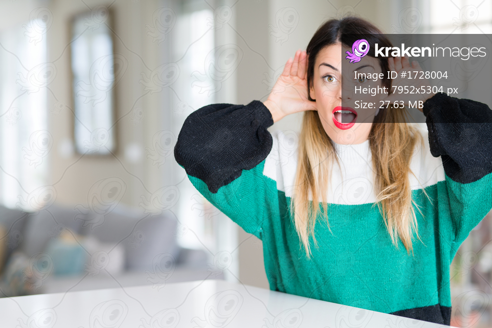 Young beautiful woman wearing winter sweater at home Trying to hear both hands on ear gesture, curious for gossip. Hearing problem, deaf
