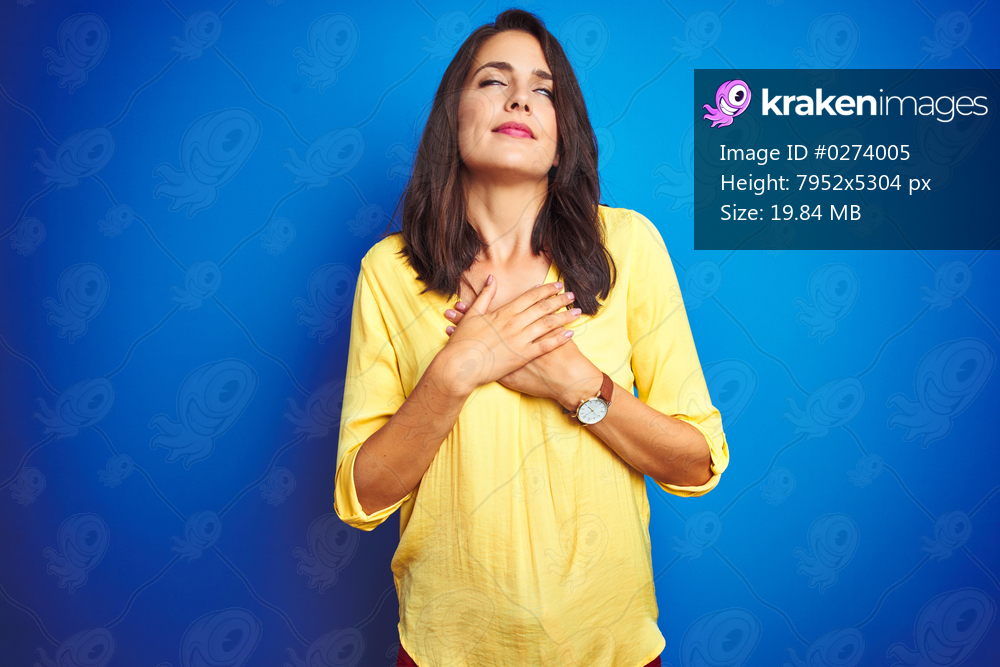 Young beautiful woman wearing yellow t-shirt standing over blue isolated background smiling with hands on chest with closed eyes and grateful gesture on face. Health concept. - Kraken Images