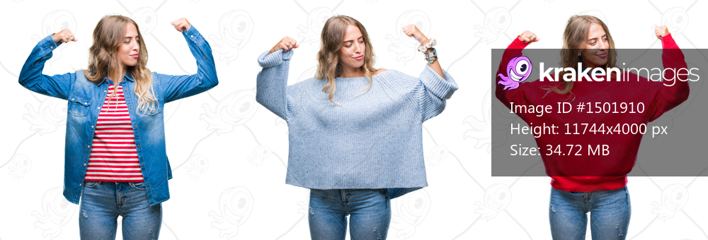 Young beautiful young woman over white isolated background showing arms muscles smiling proud. Fitness concept.